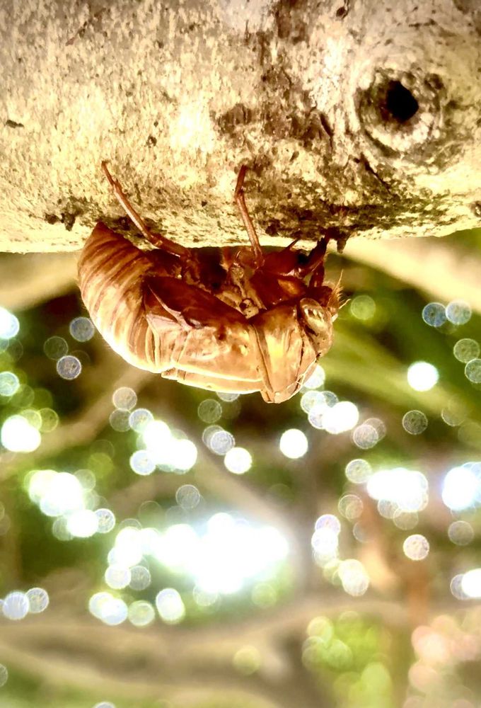 📝この写真画像は、宮崎市阿波岐原前浜に在る"喫茶店ウルワシ_一つ葉店」の庭の木にぶら下がっていた蝉の抜け殻を撮ったものデス🐶