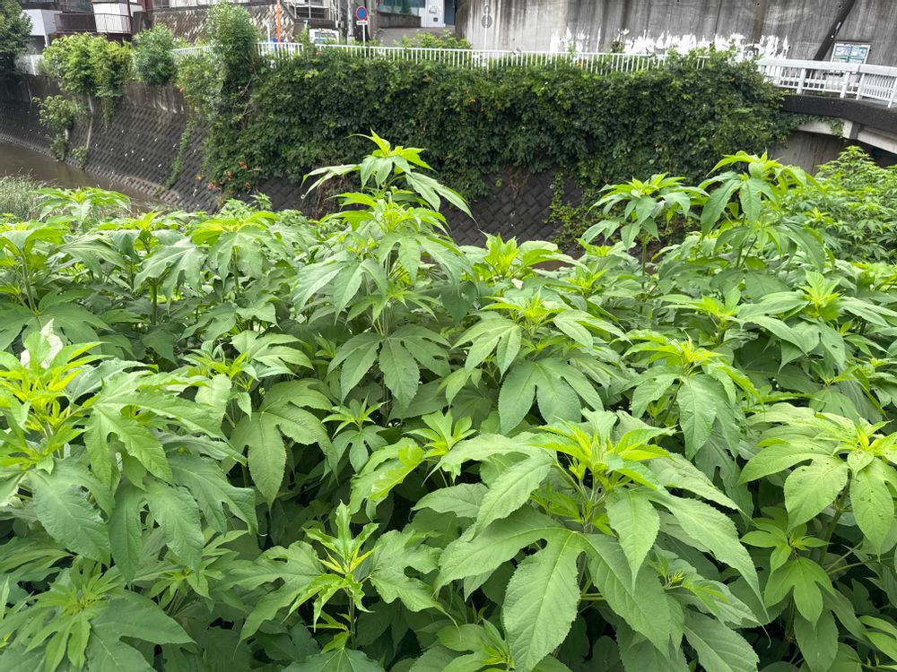 川沿いに生えていて、2〜3メートルはありそうなこの植物。葉は3〜5股に分かれてるようで一枚が大きいです。なんだろう。