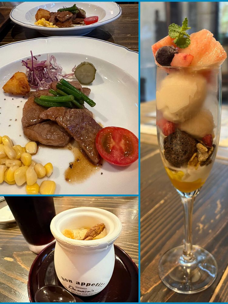 ③④⑤香川県観音寺市のお店にて、お魚もお肉もスイーツも程よい量で、全て美味しくいただきました。私は今年初の桃だよ➰🤤🍑🙌ワーイ