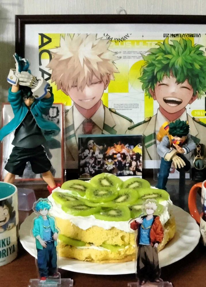 ヒロアカの緑谷出久くんが7月15日が誕生日だったので、お祝いにイメージカラーの緑のキューイケーキを作りました🎂🎉