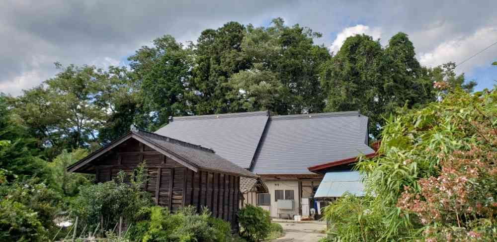 この屋根の下には茅葺き屋根が隠されています。茅葺きでは維持費が大変なのと職人が少なくなった為トタンで覆いました。後ろにある木立はこの地方(宮城県)独特の屋敷林で「いぐね」と言います。