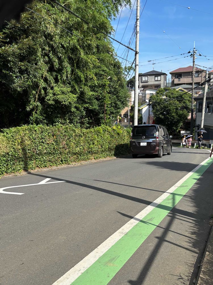 子どもたちの集団を越して軽自動車が来て、道を塞いで停車。