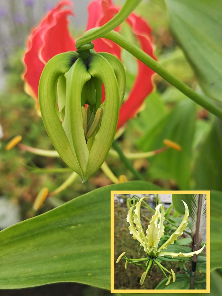 グロリオサの蕾、穴があるから中の蕊見えてます