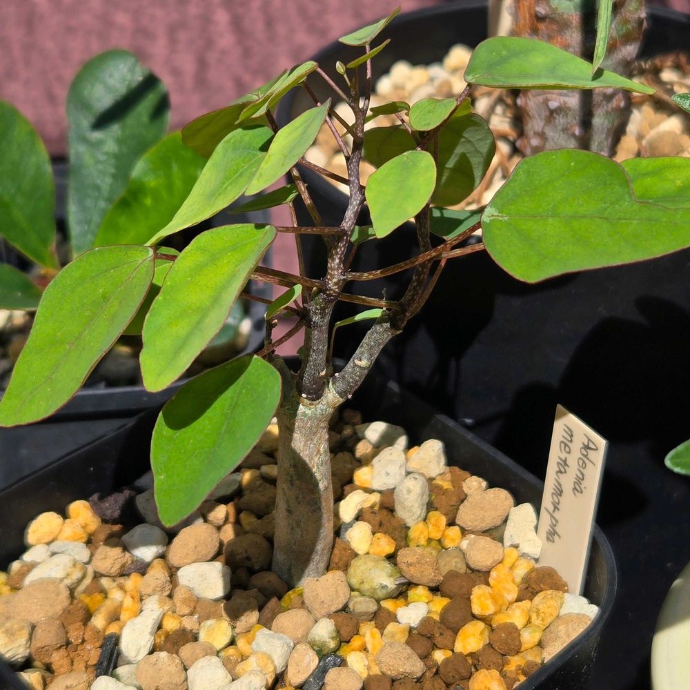 ボンバックスの赤花、ナメクジスタイル 小さい時に強風で葉が千切れてから、三枚以上葉が生えた事がなく、幹も太らず。 今年こそは!