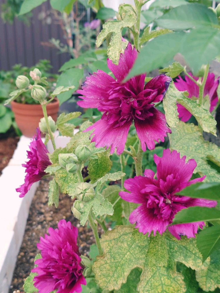 別名タチアオイですが10センチ位の華やかなお花が次々と咲いてくれるコンパクトな品種です🟣