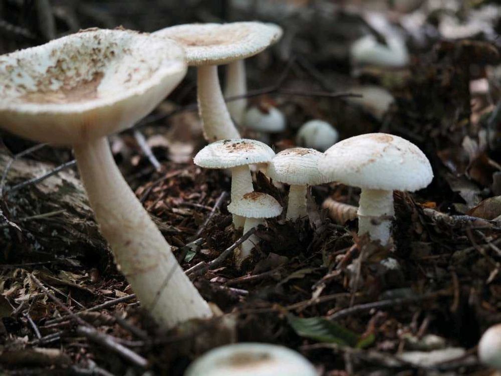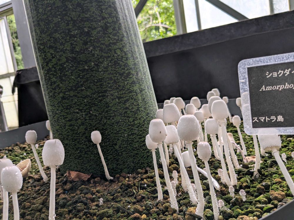 ①②この前開花したショクダイオオコンニャクとは別の個体、大きな葉の根元にキヌカラカサタケの大群🙌