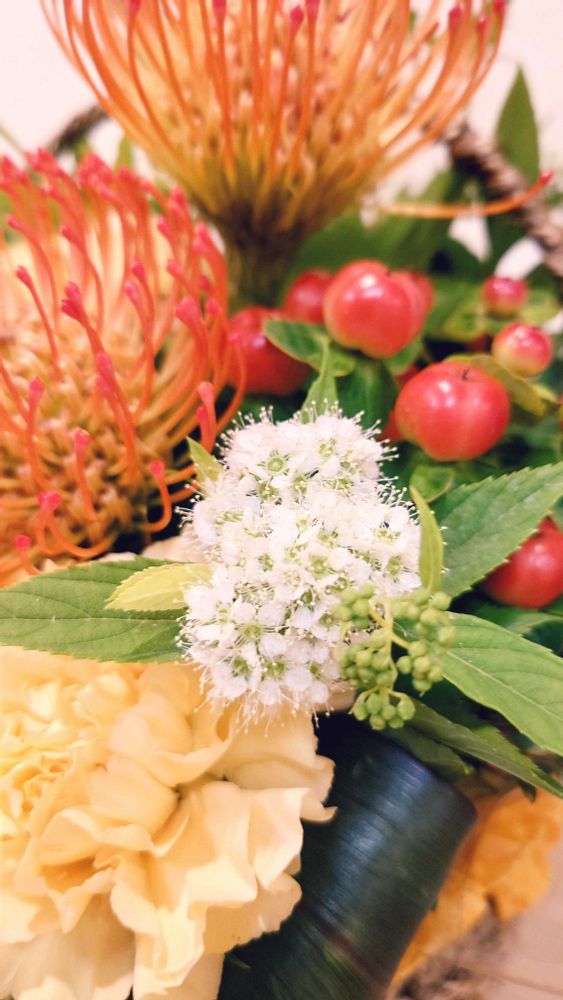今週はピンクッションとヒペリカムがかわいいアレンジです。