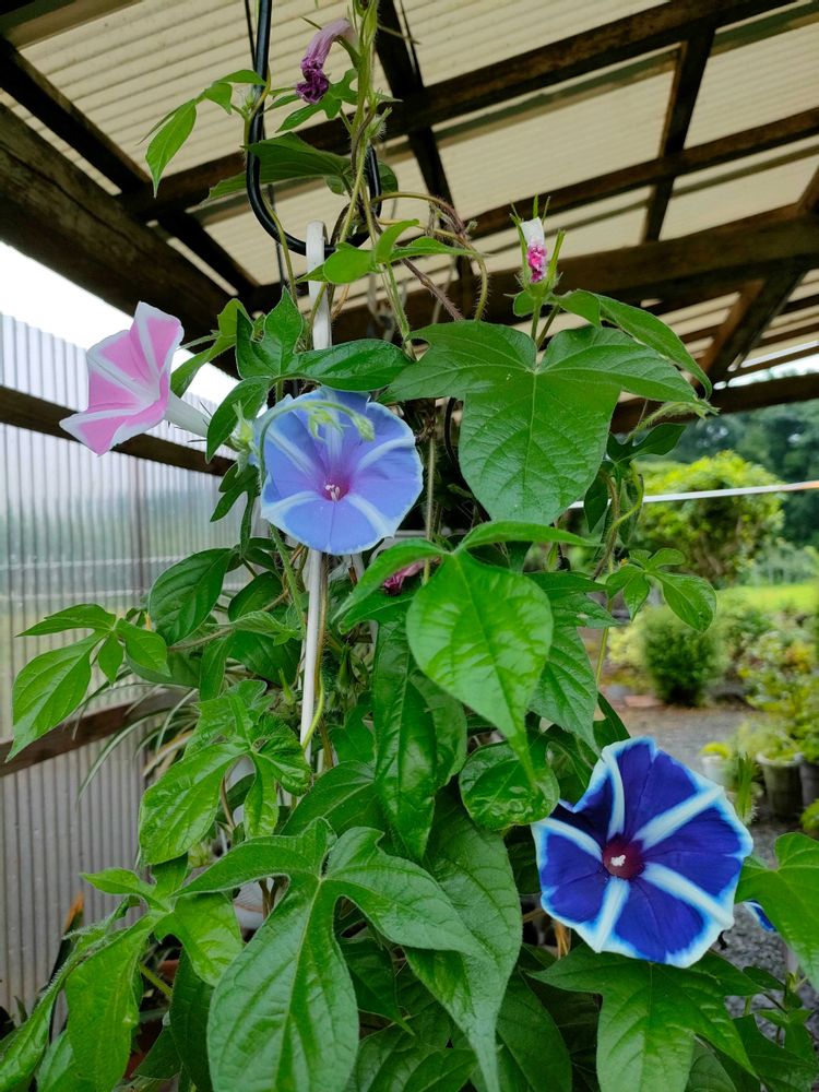 ハンキングにした朝顔に今朝3色咲いてた〜😍