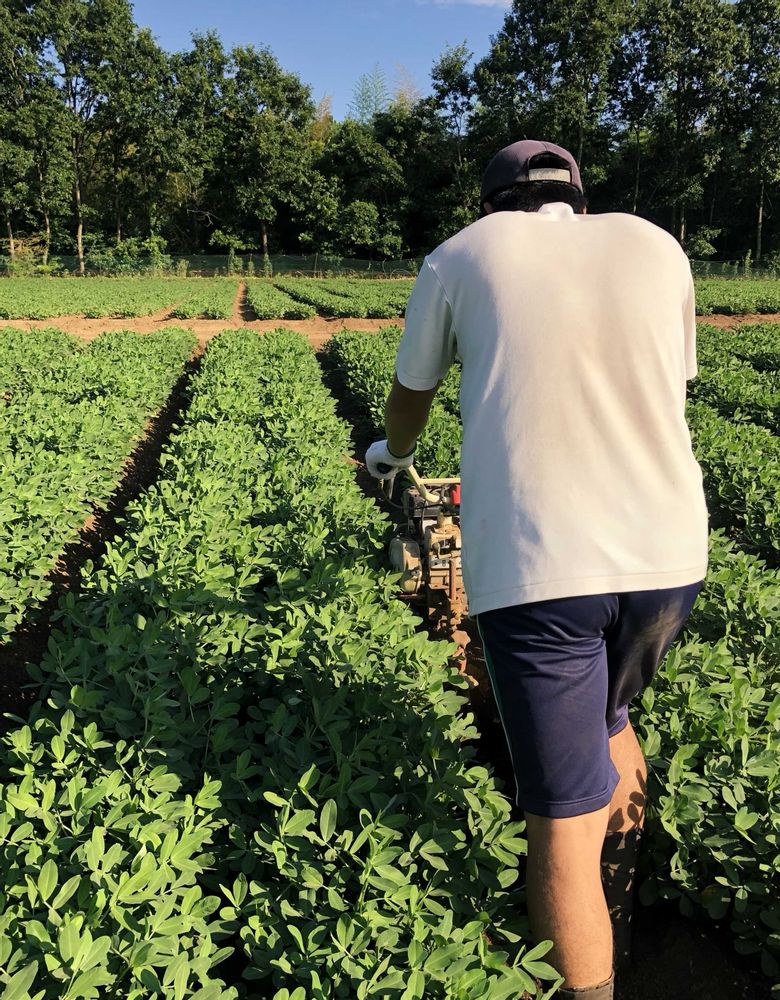 5枚目 落花生の草取りとマルチ剥がしをしました。管理機は息子が入れています。培土して 畝を作っています。