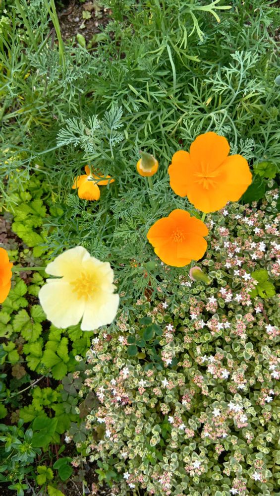 庭のハナビシソウです。💛色の中に、クリーム色の子が、1人いました。😊