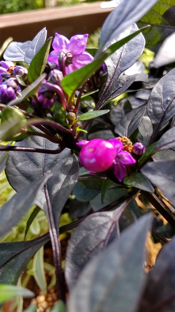 我が家の唐辛子は花の後の実が丸い実が紫色何ですよねぇ〜?唐辛子でも種類が違うのかなぁ〜と、、、?
