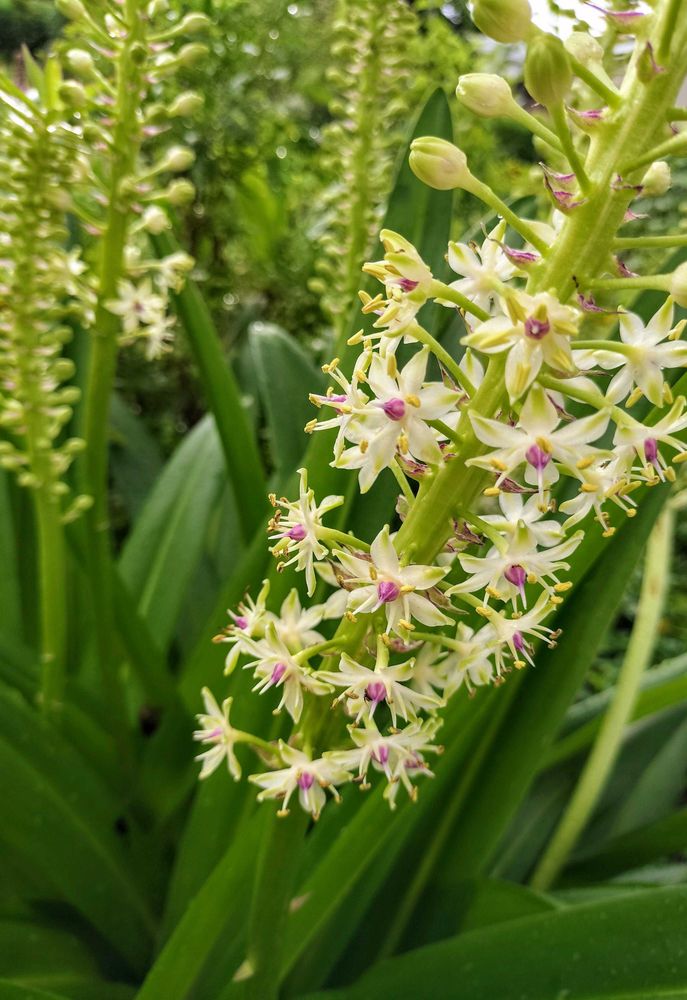 パイナップルリリーは一昨年1本だったのにみるみる増えて今年は10本も花が立ってます😆