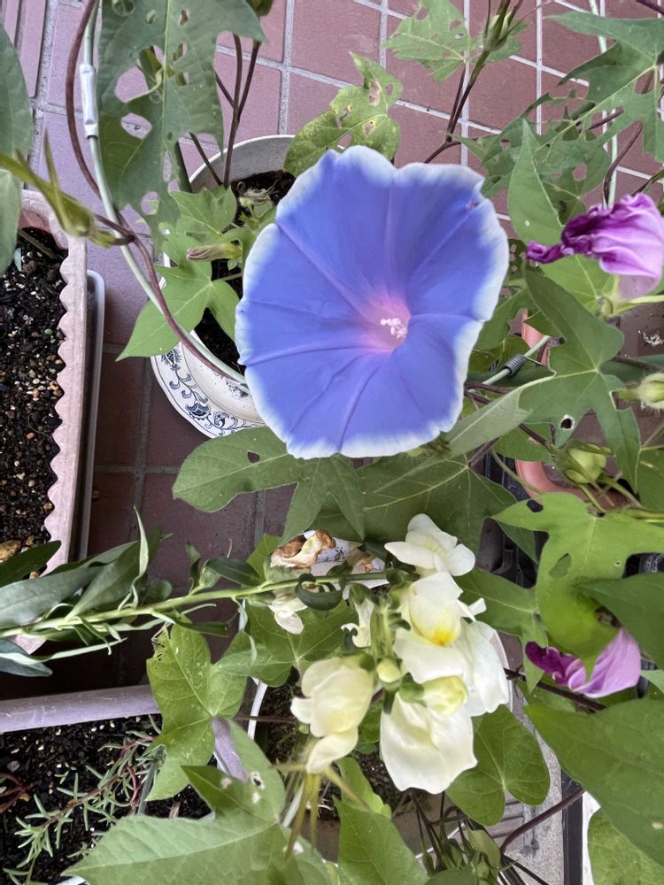 おはようございます。薄曇り、26.9℃、9:10ムシっと暑い。今日から孫たちが夏休み、早速昨晩からお泊まりに来てます。混合百日草73日目花が咲きました。和花エレガントミックス73日目コスモス、ひまわり、ジニアが咲いてます。垣根朝顔2世90日目、金魚草8世と一緒に咲いてます。マリーゴールド4世120日目バッタさんお食事中ですかね〜。😍🥰😻😸😋☺️