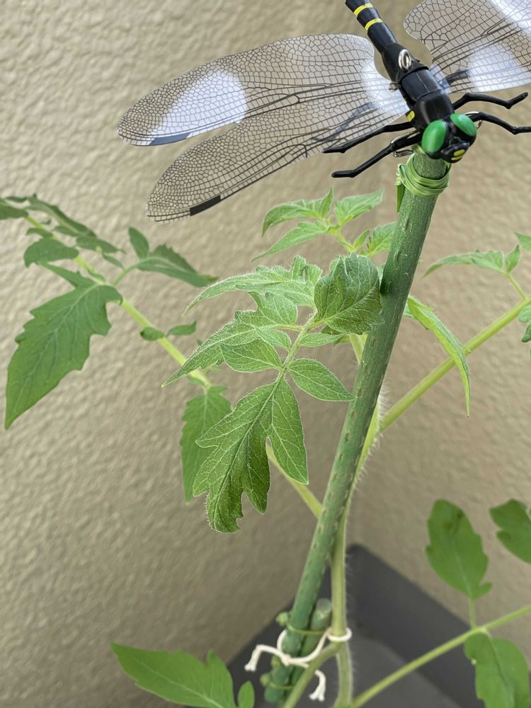 ②モ◯バーガーでもらったトマトの苗、夫がAmazonで買ったらしいオニヤンマくん乗ってます=|=
