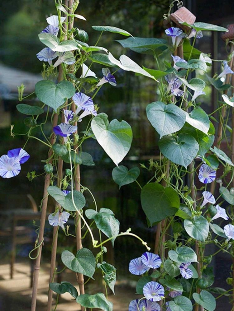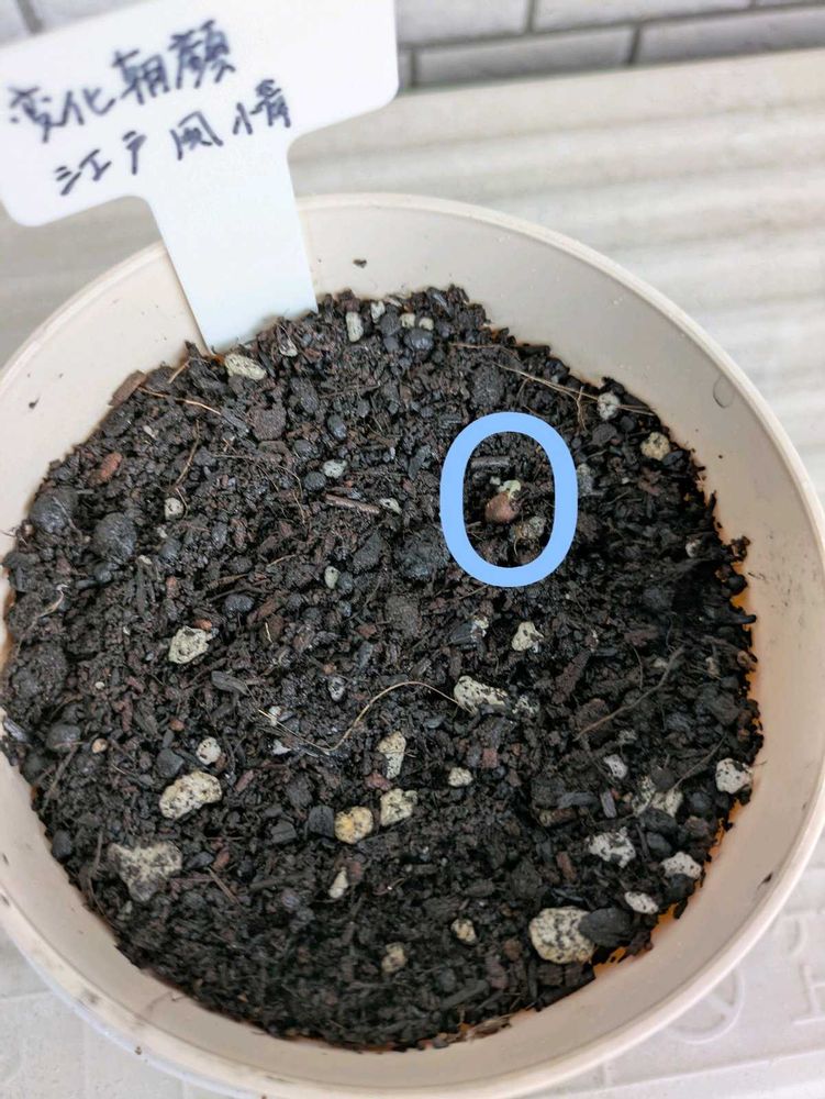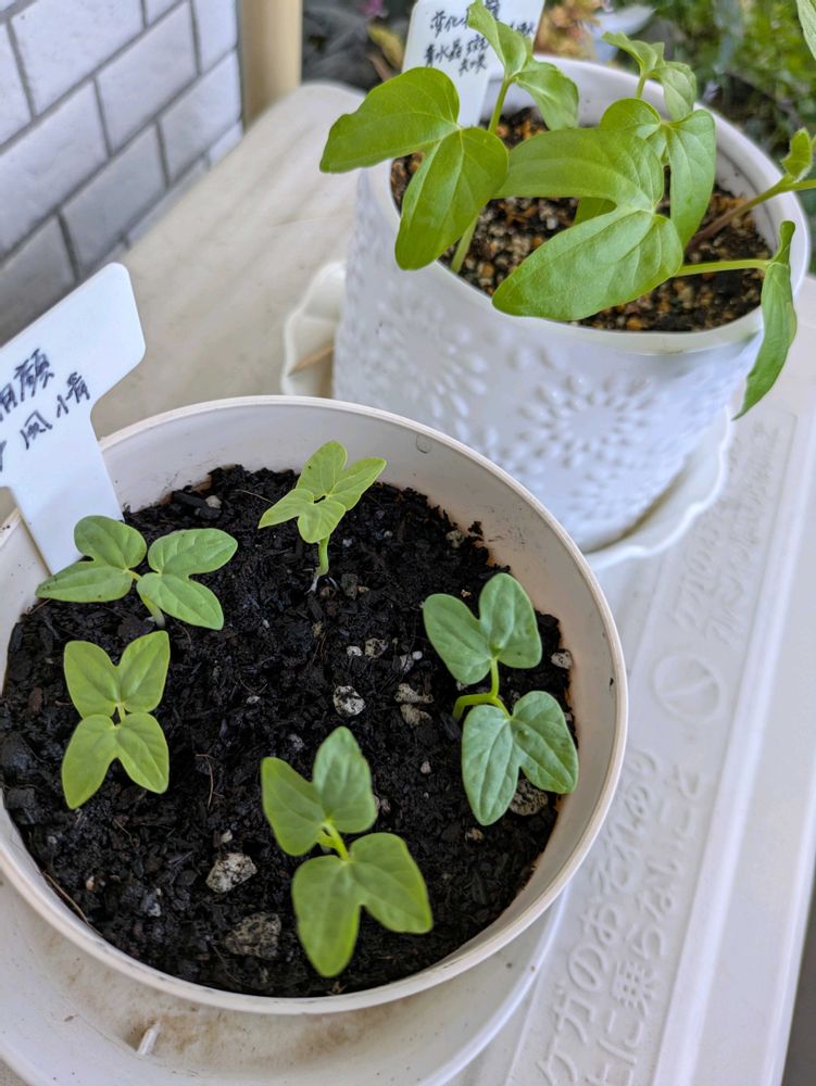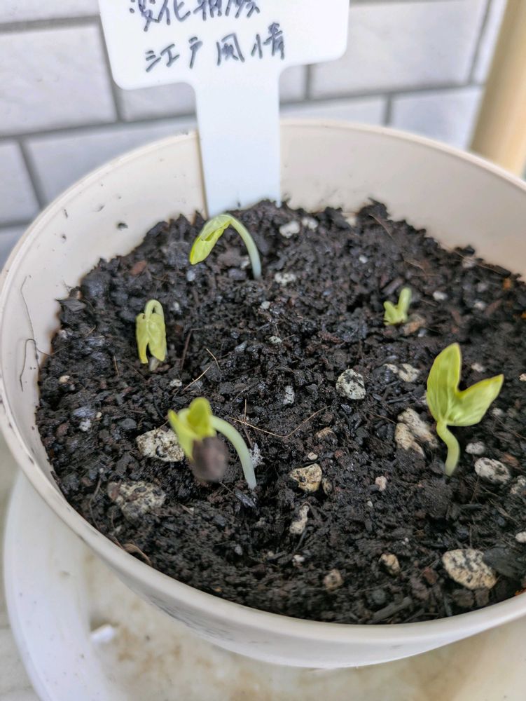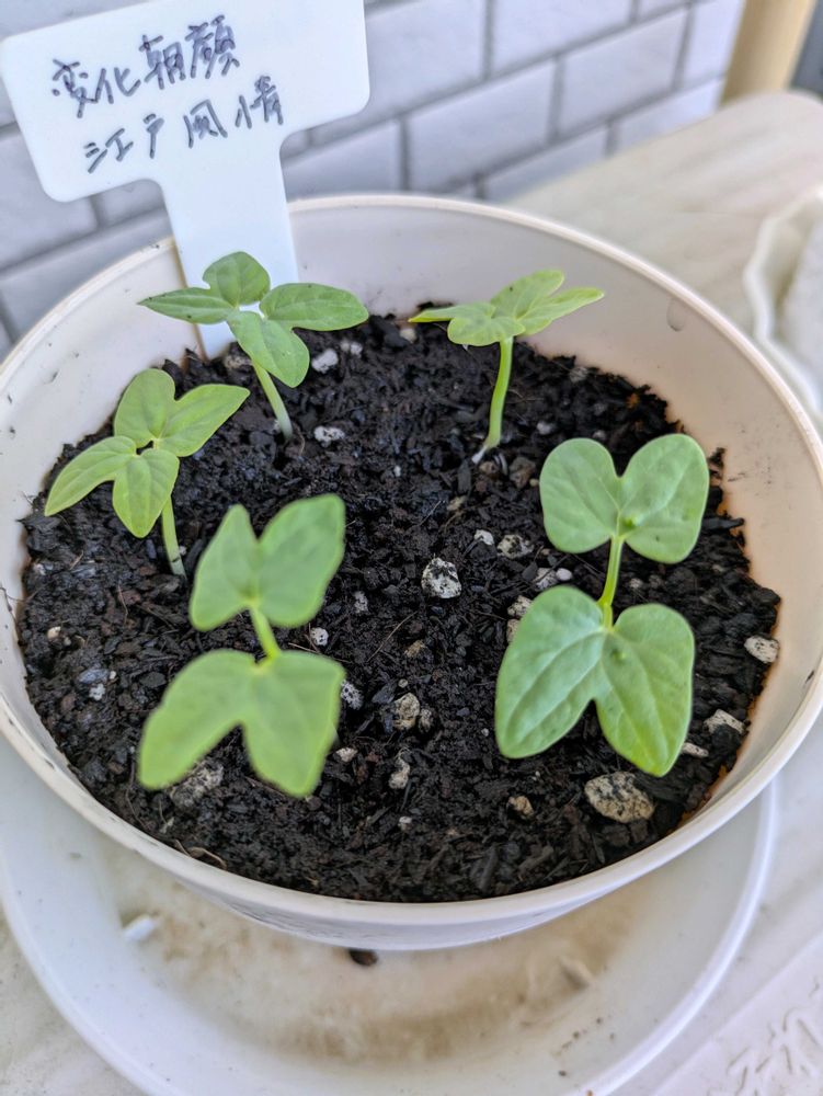 切り目をいれた種を一晩浸水し、種まきして1日で芽がでだしました。日に日に双葉が緑こくなってきましたが、先に蒔いた変化朝顔 青水晶より大分ミニです。可愛い〜 種も小ぶりだった。こちらは青白でいろんな模様が咲くみたい。開花の写真はネットからお借りしました。