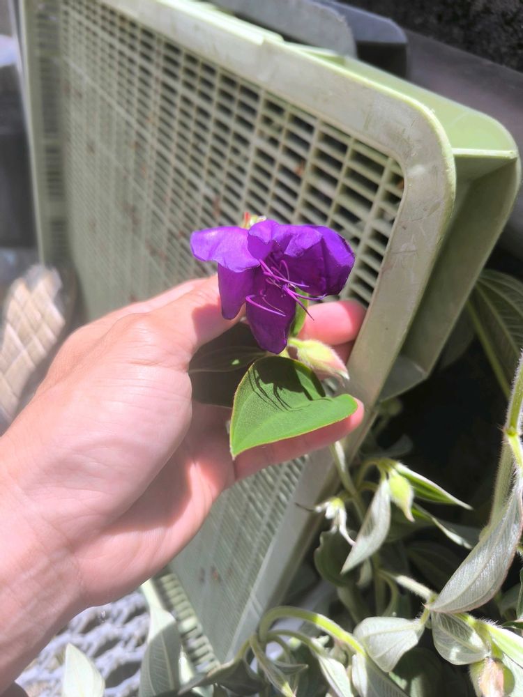 お客さんからの頂き物。何て花か分からなかったけど、レンズで調べたら紫紺野牡丹だそうで初めて聞いた名前だった。