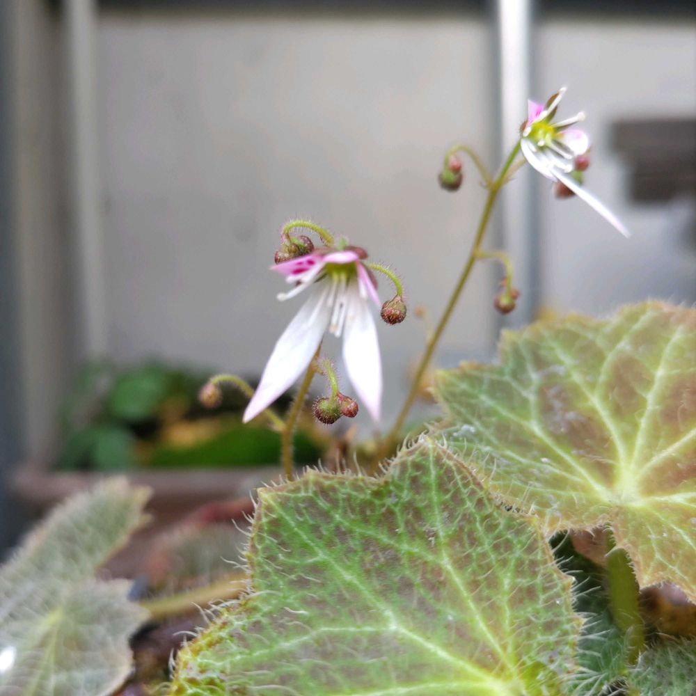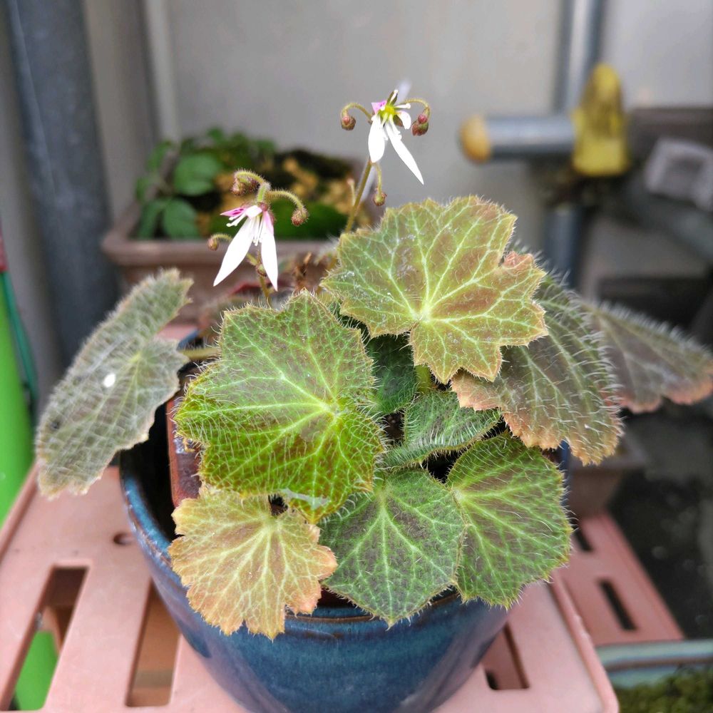 (地道投稿)朝から暑い日🥵体もまいりました😳日陰に置いてました1️⃣ツルユキノシタ数輪咲きました2️⃣少しアップの姿、一瞬暑さ忘れました。可愛いてますね🤗