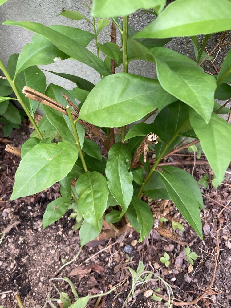 昨年、植え替えたアジサイ①②。勝手口側が気に入らなかったようで、やっと咲き始めました。同じ場所に植えたニオイバンマツリ③も枝が全て枯れてしまい、諦めていたところ、新芽が上がってきました。