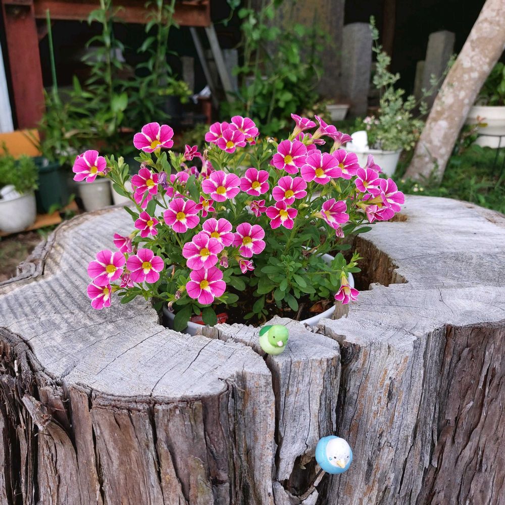 切り株に直接土を入れてお花を植えたら素敵だよ