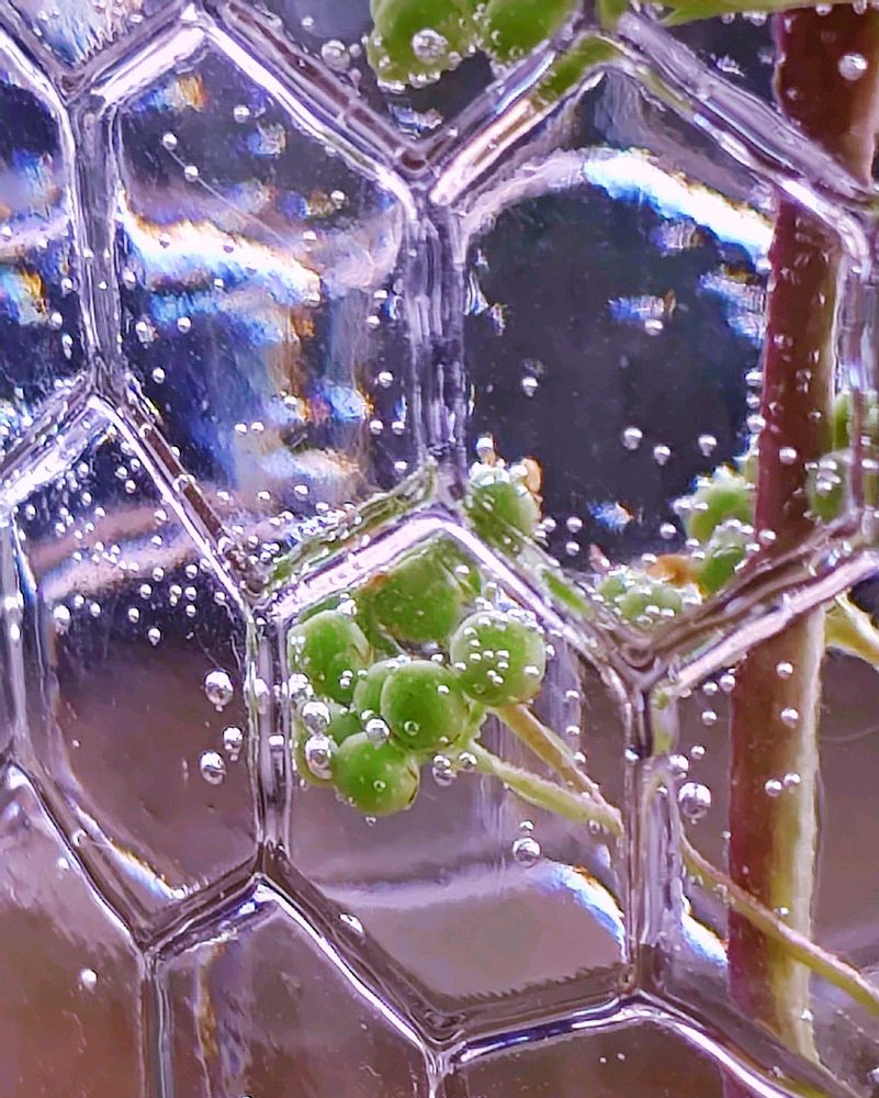ハニカムのガラス瓶の中のシュワシュワとコムラサキ、美味しそうに見えます✨😋