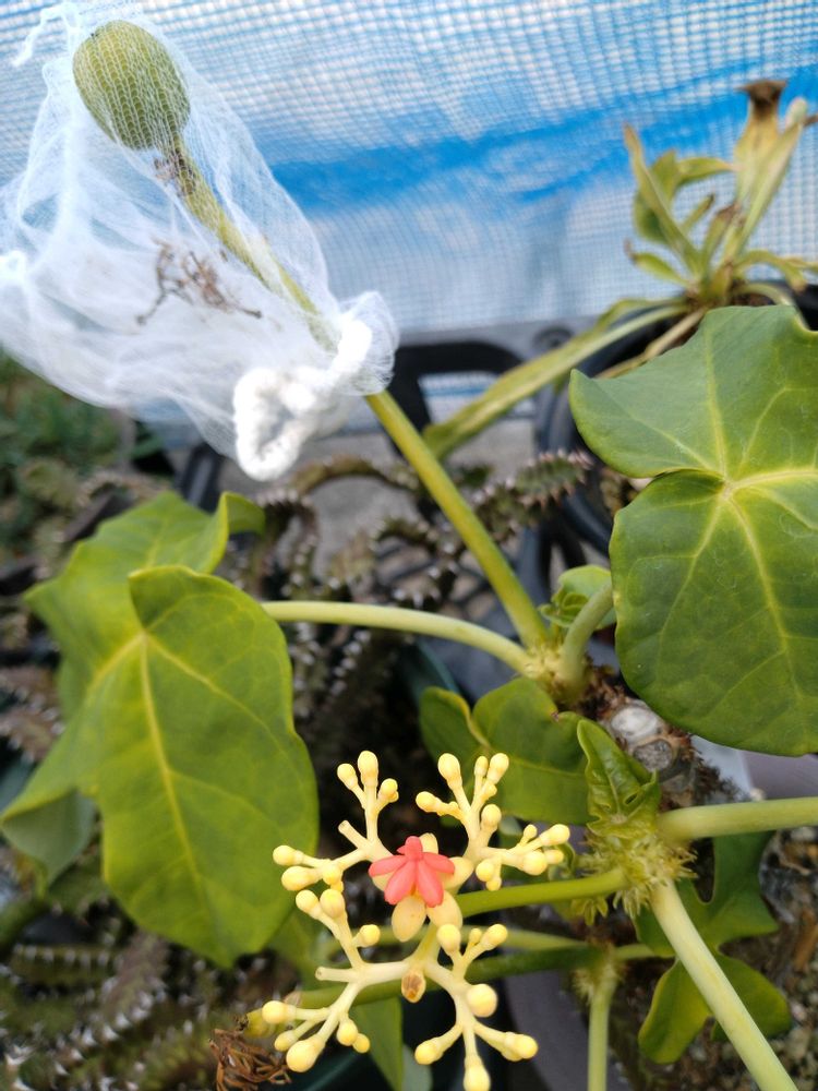 5枚目、黄色♀花が咲くがお相手がいないので赤♂🌼でちょんちょんしておく。