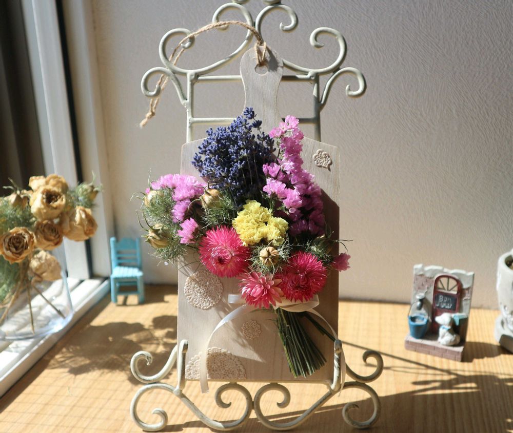 お花を束ねて、カッティングボードにグルーガンでぺたっと貼りつけて出来上がり😆💐