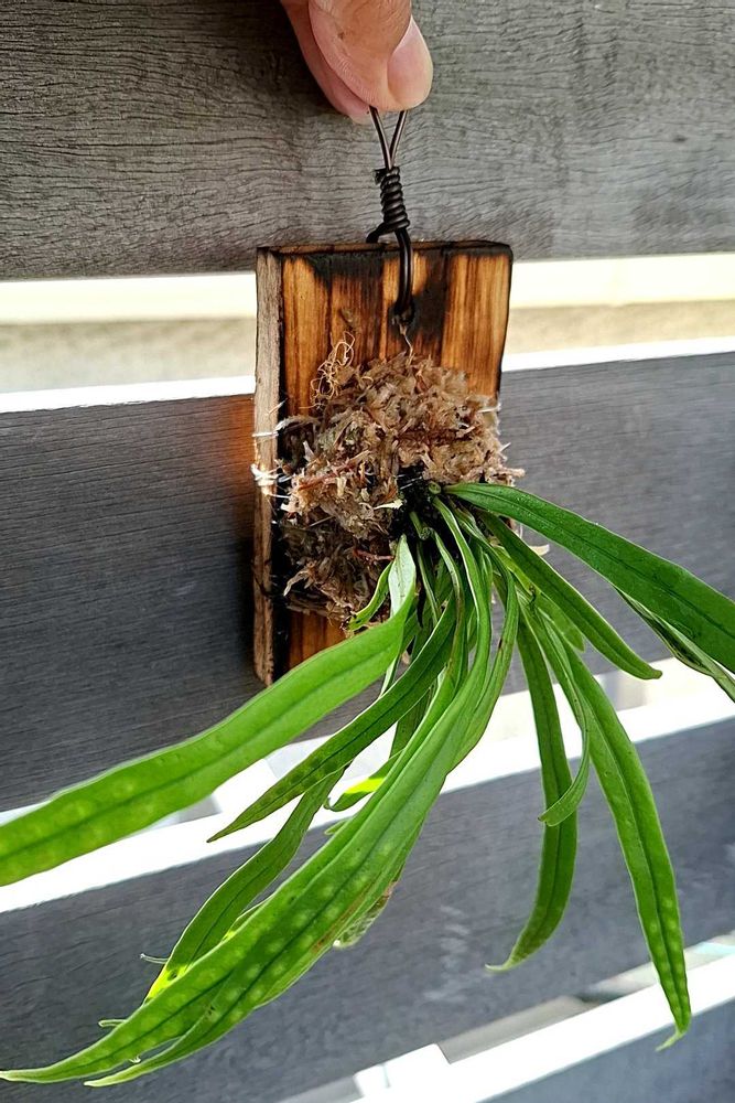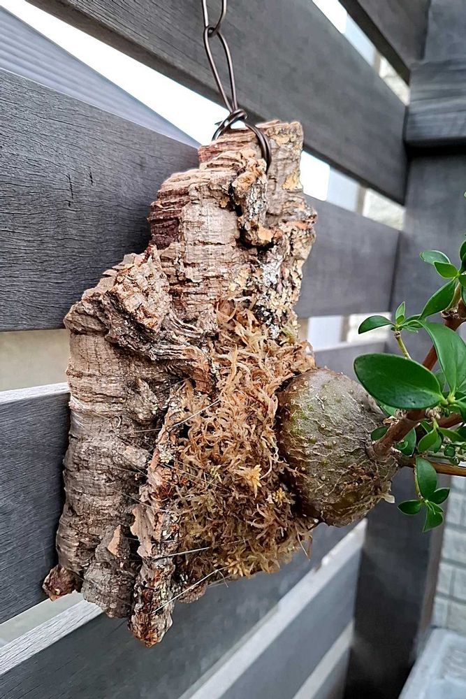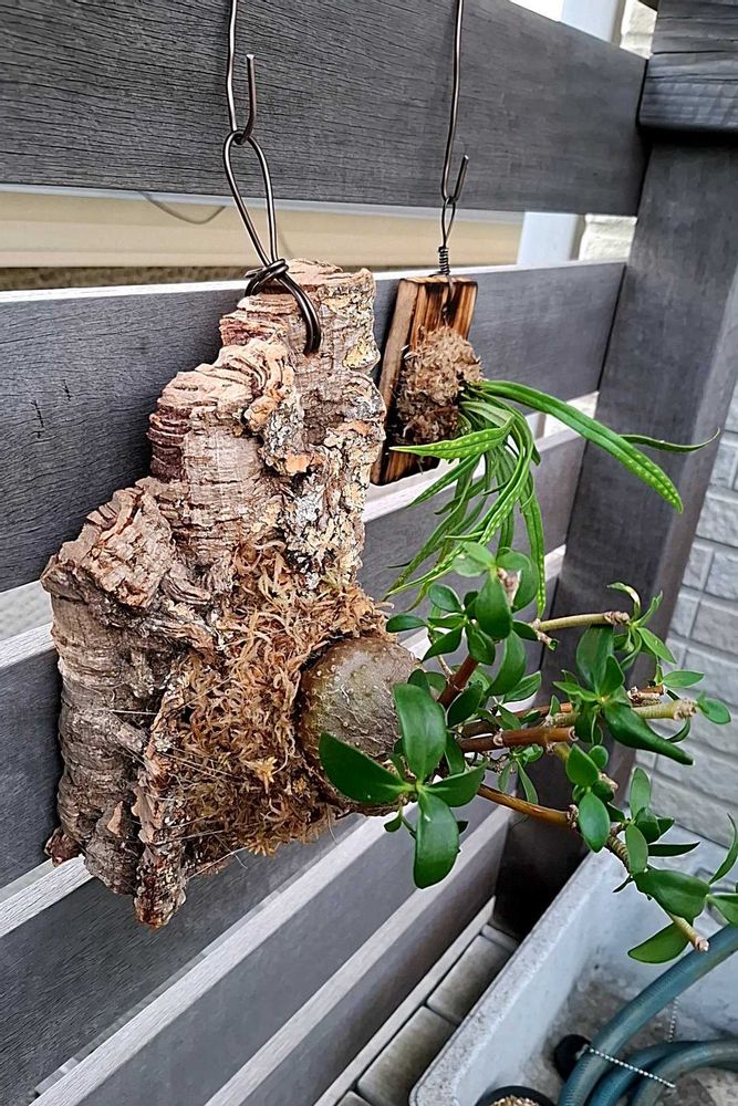 ③かまぼこの板を炙って、その辺の木から剥がしてきたノキシノブを余った水ゴケで板付にしてみた。名付けて「0円板付け!」