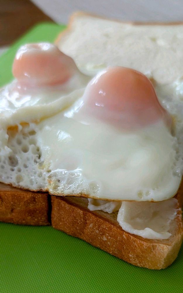 実はホットサンドにするために焼いたんだけどホットサンドのフライパンで卵二個の目玉焼きを焼きました