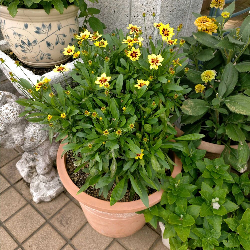 【1枚目】2年目のコレオプシス・ソーラーファンシー。6月28日に12号に鉢増ししたばかりなのに、1ヶ月もしないうちにこんなにモリモリなんですが? 生育旺盛過ぎやしませんか?💦
