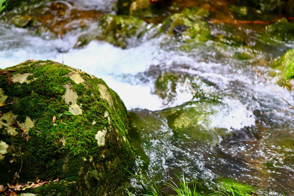 苔むした岩と荒れた川水