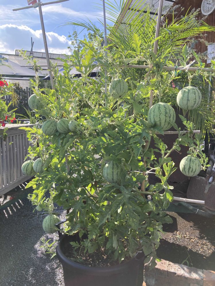 ここんばんは((˶ᐢ∇ᐢ˶)ฅ👒🌱。:°ஐ..♡*⑤の鉢植え( ᯅ̈ )のすいか。