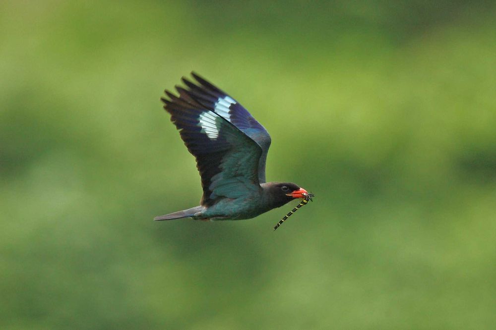 ブッポウソウがオニヤンマを咥えて飛ぶ姿