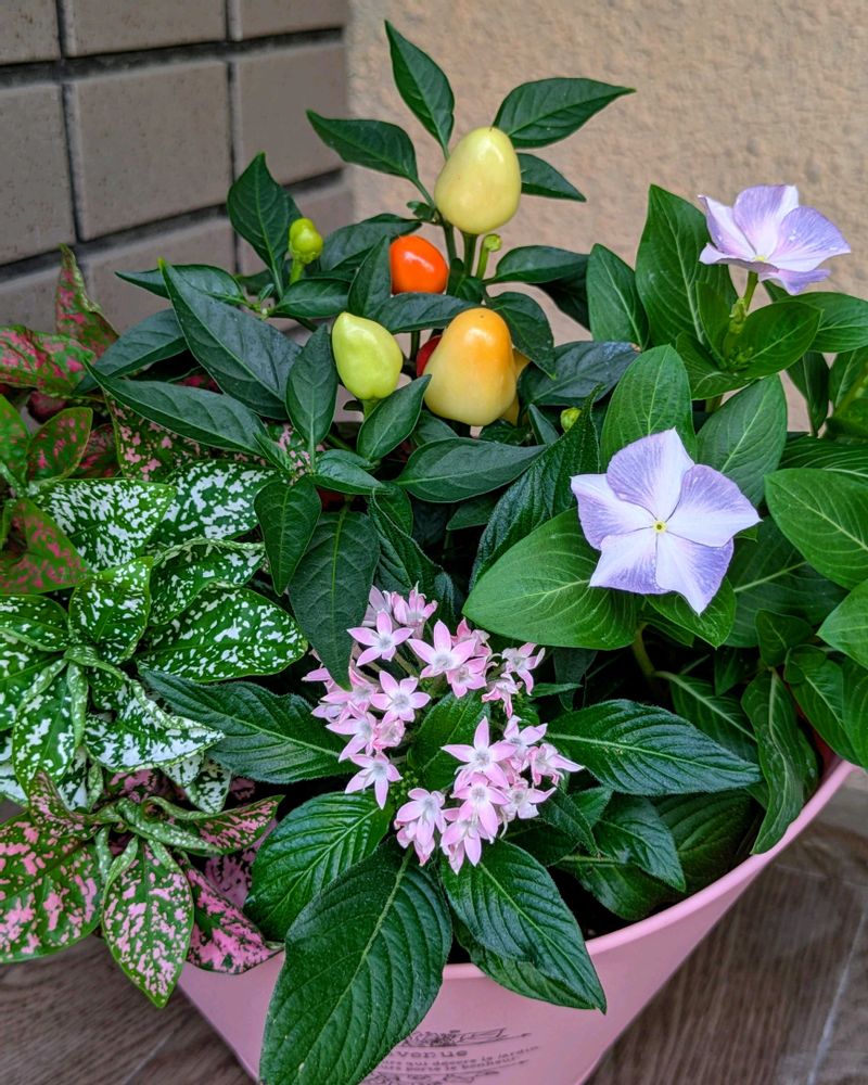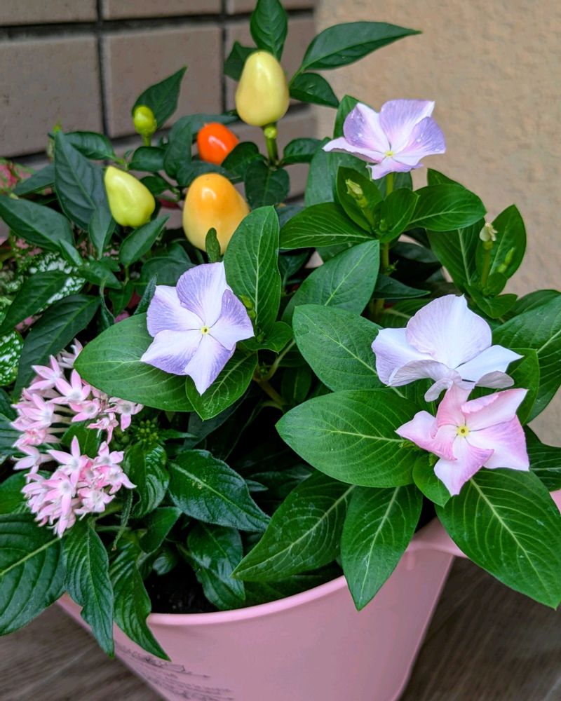お花とピンク色の鉢がマッチしてとてもかわいい寄せ植えですね💕