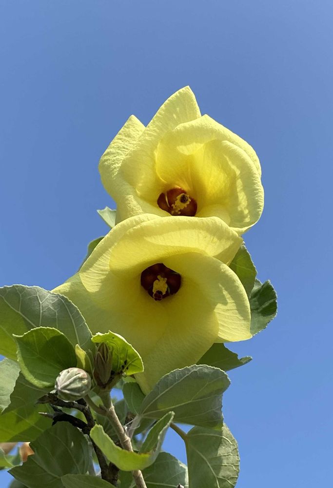 💙🩵💛空と 花色が爽やか感じですねーヽ(´▽`)/❣️ とてもイキイキと 夏に強い花かなぁ⁉︎ 👀て オクラの花🌼に似てるような…明るい花💛💛綺麗🤗