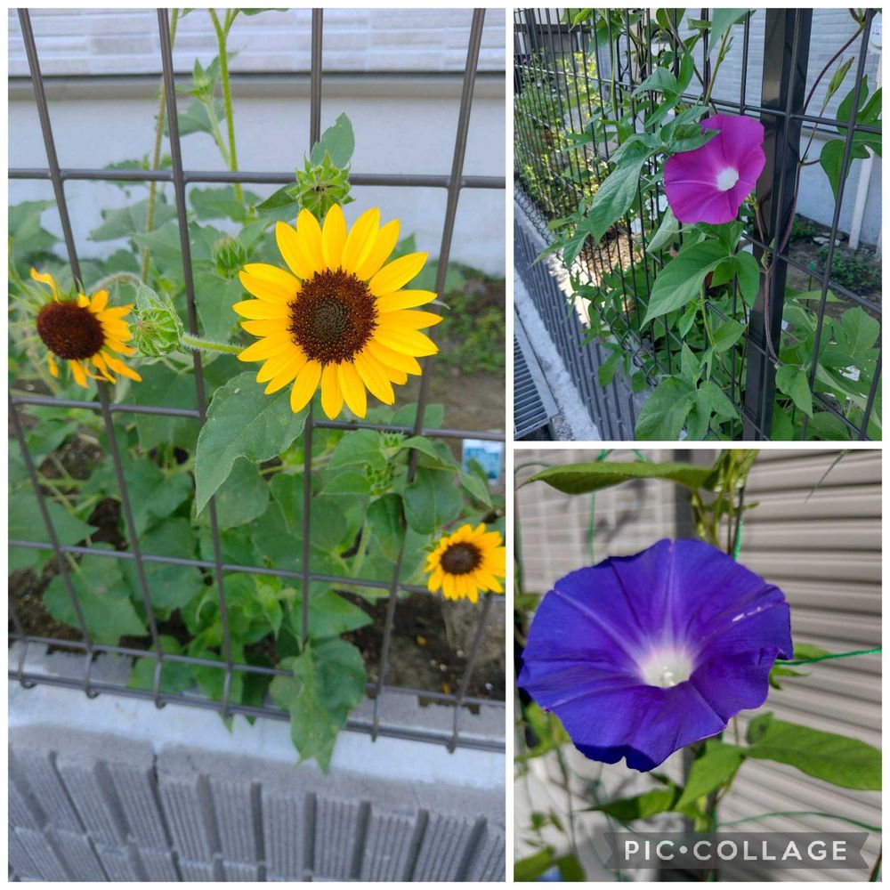 庭の夏の花たち。ひまわりアポロンさんと種蒔き朝顔さん。