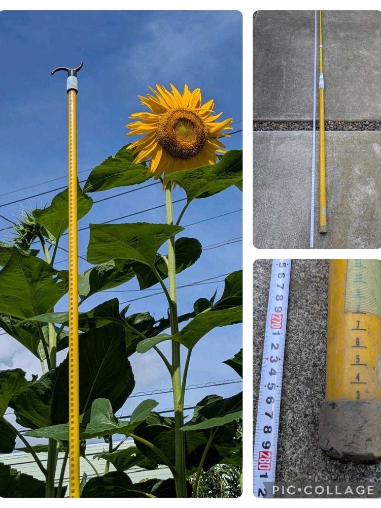 ひまわり🌻の高さがどうしても測りたくて、伸びる棒を使ってそれを横にして