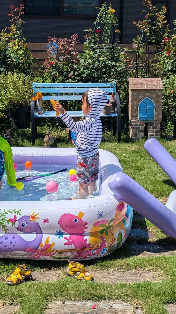 孫3号はご機嫌で遊んでいて、1号がタンクを背負うタイプの水鉄砲を背負わせようとしたら、重くてバッシャーンと倒れて、私が助けたもののビックリし過ぎて😭退場