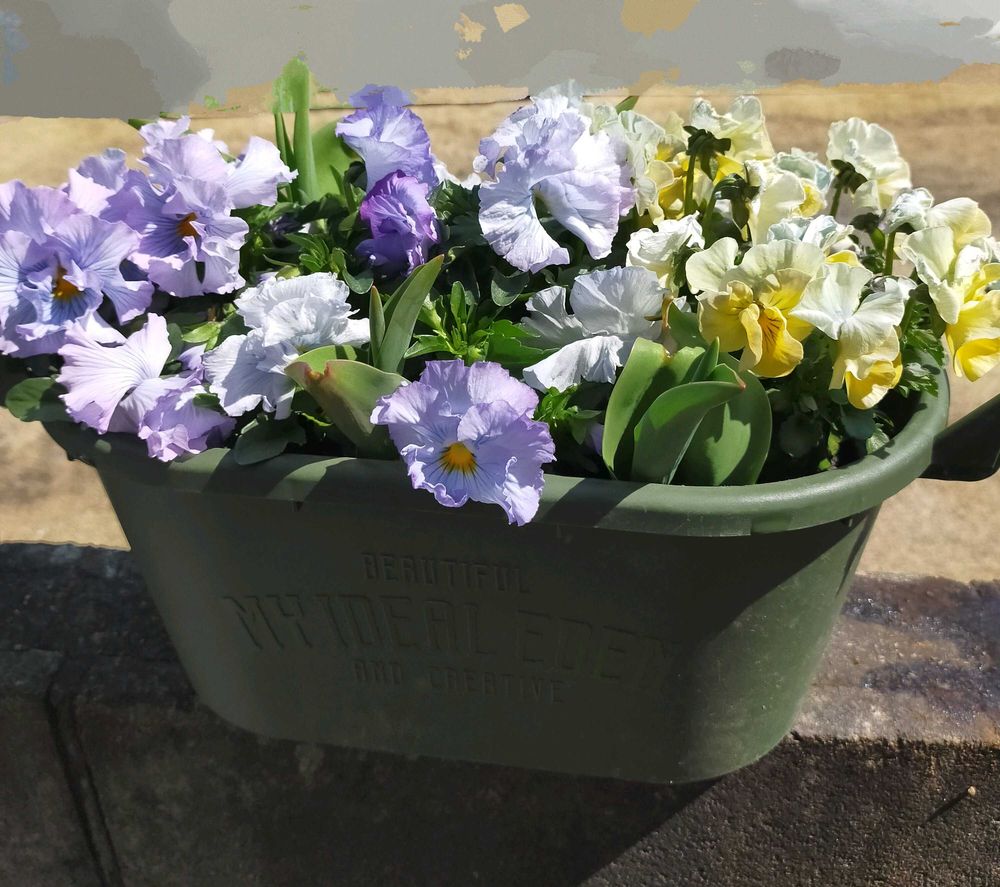 春の寄せ植えの記録です。絵になるスミレ・パルムとパンジー・シエルブリエ。