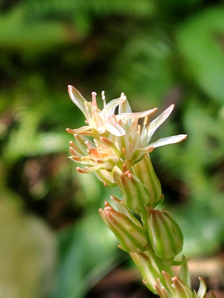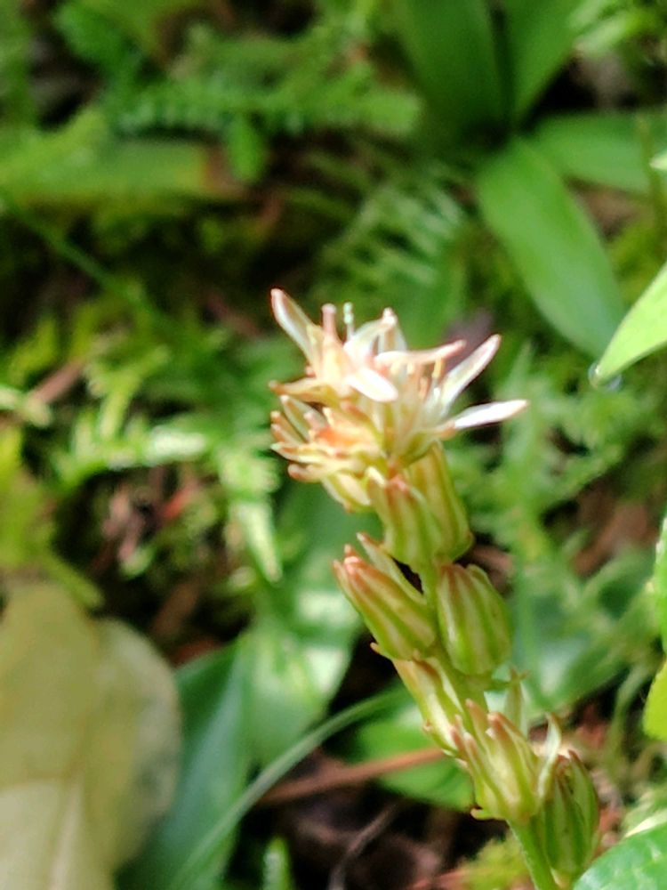 穂状〜総状花序を付け、長さ2〜4mmの花柄の先の総状花序に直径1〜1.2cmの緑色を帯びた淡黄褐色の花を横〜上向きに多数付ける。