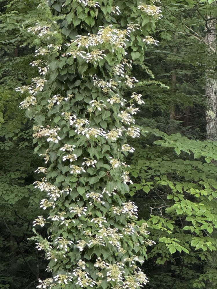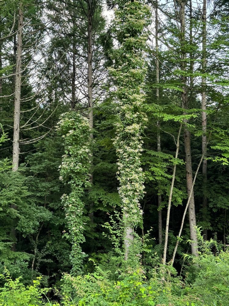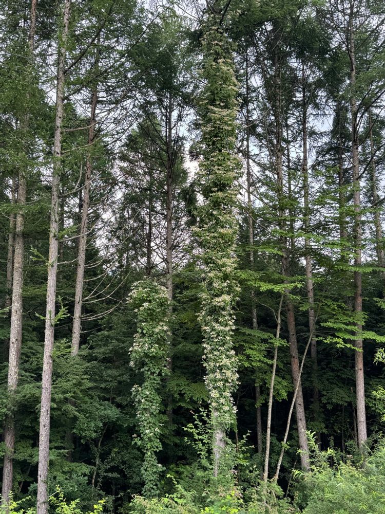 車の中からカラマツ(かな?)に盛大に絡まっているつる性の花を発見❗️