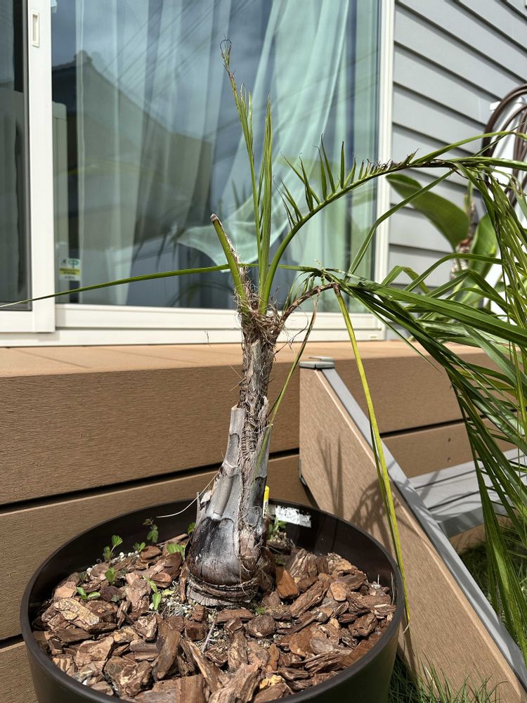 ミュールパームの調子がイマイチです。2,3枚目に出た葉が矮小化してしまいました。根腐れか害虫かは分かりませんが、植え替えか地植か悩みます。