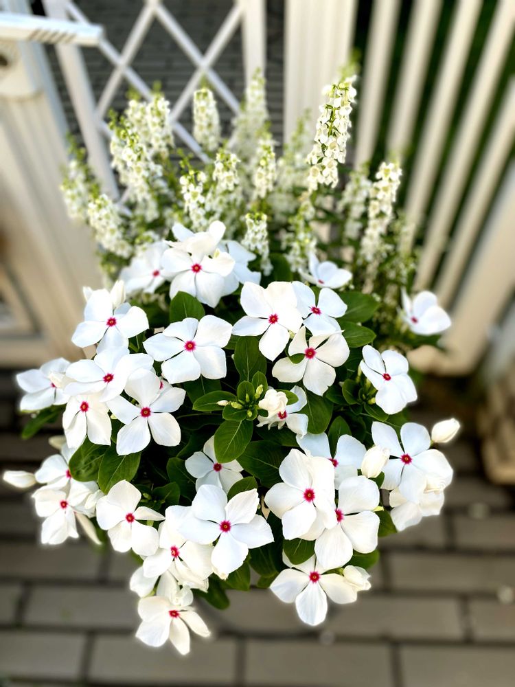 白の寄せ植えが大好きです。日々草の白も大好き。これは98円、でっかくなりました😊