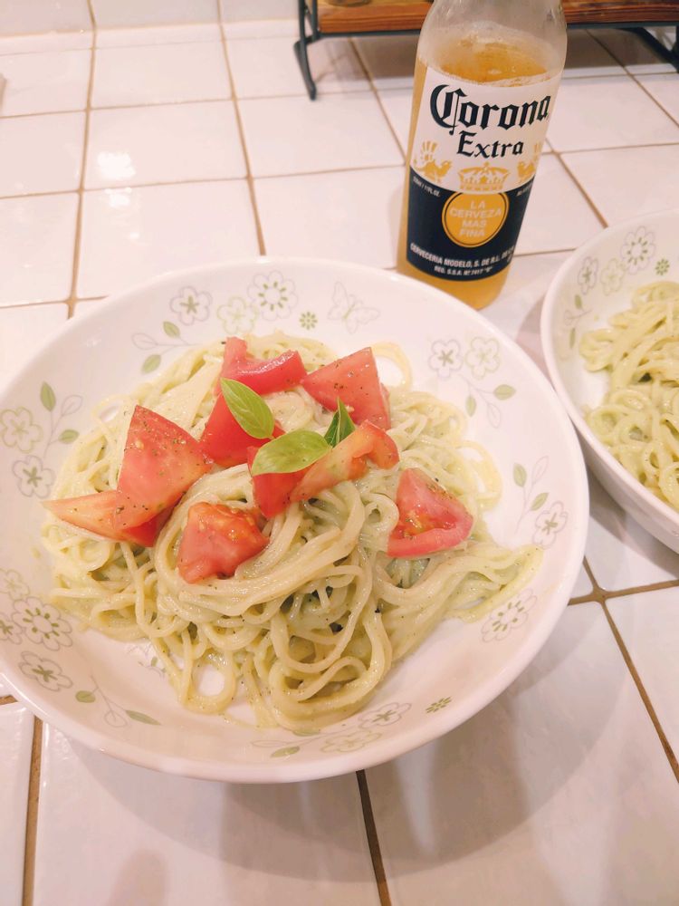 ビール片手に作ったメインディッシュ、自家製のバジル&トマトの冷製ジェノベーゼ🍝