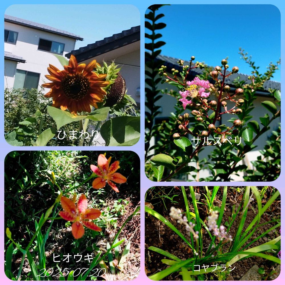 ひまわりやサルスベリの花は青い夏空に映えて元気いっぱいですが、庭の少し木陰を見ると山野草のヒオウギやコヤブランが咲いてました。