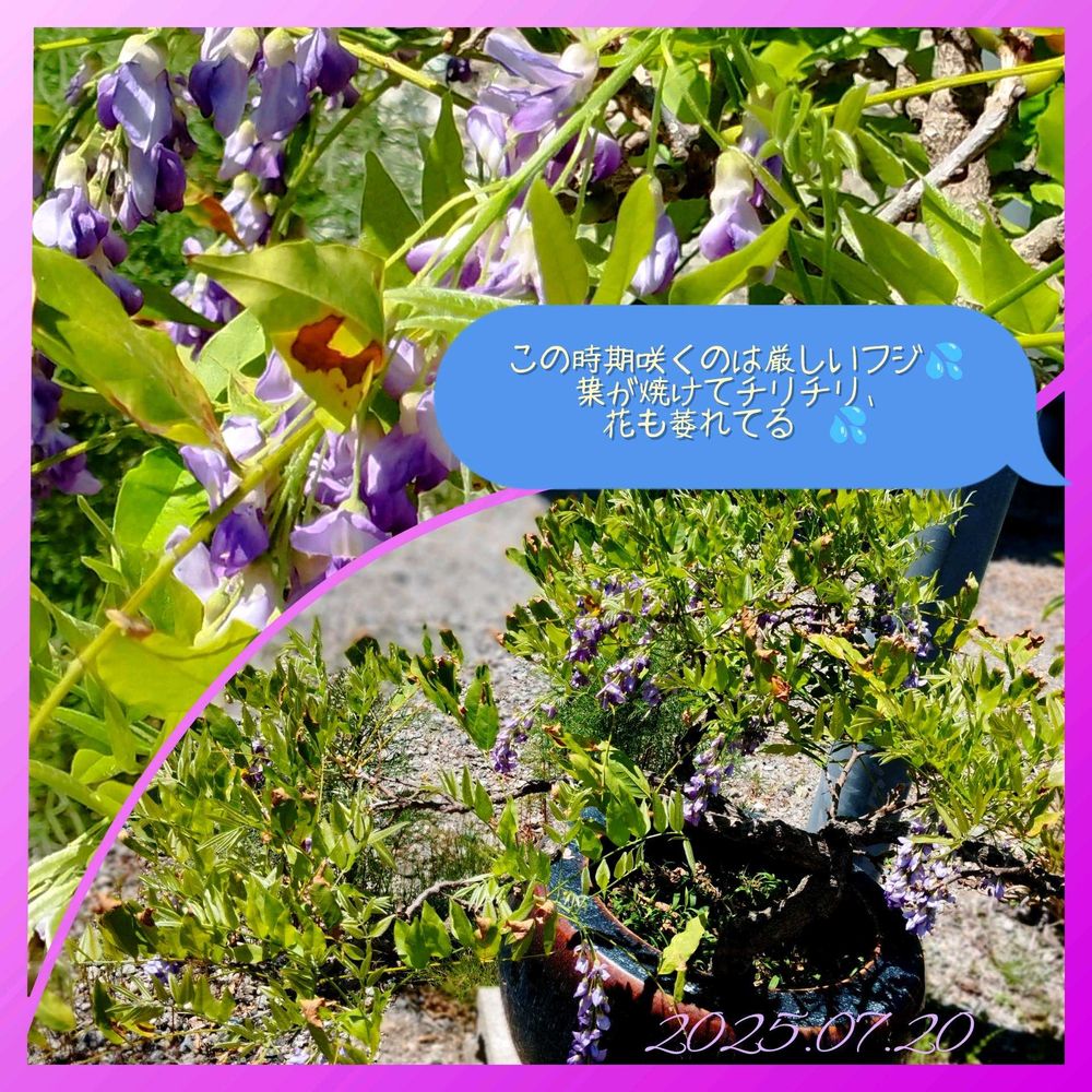 真夏に咲いてしまったフジ、毎日お水たっぷり上げていますが、日差しが強くて葉は焦げて所々枯れ、花も咲いてはいるけど萎れてます…やっぱり5月頃の日差しが良かったね。😂