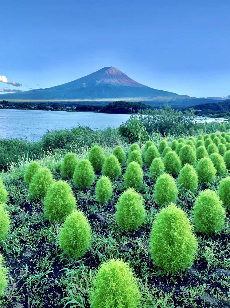 富士山を背景に、緑色のコキアが