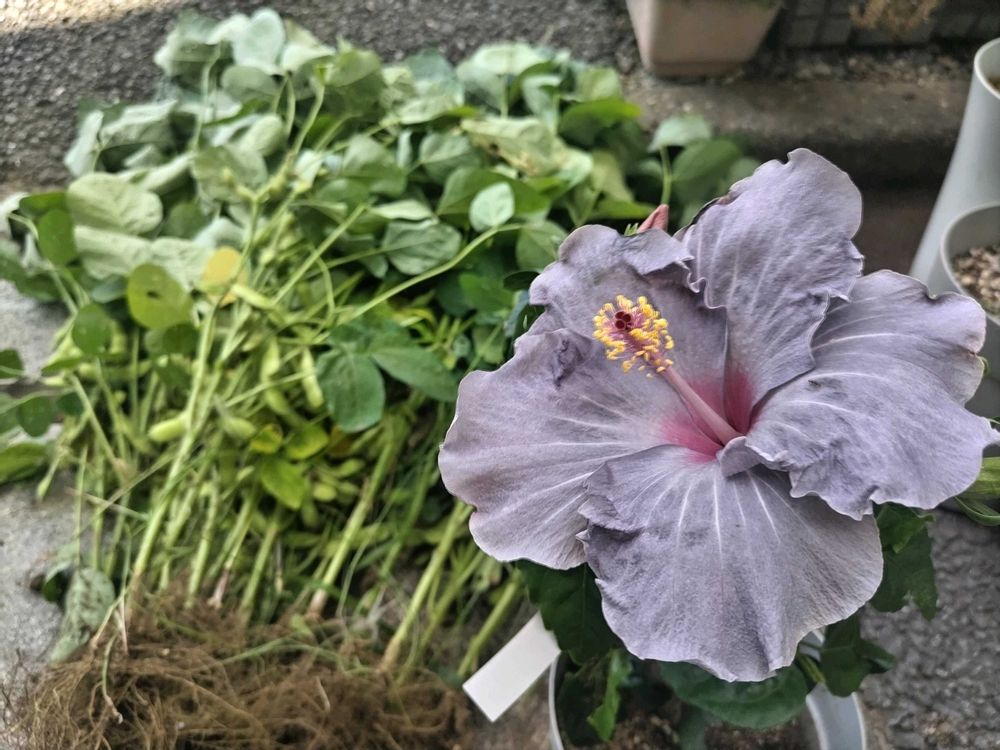 種を蒔いておけば何とか育つ枝豆の収穫。西側の日影ではハイビスカスが咲いていました。