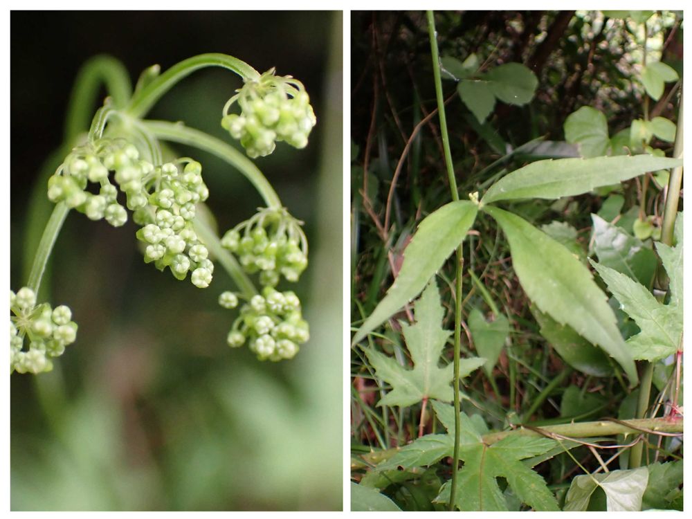別の場所で、まだ咲いていないカノツメソウに会いました。葉が違うことがよくわかりました。(⑤)