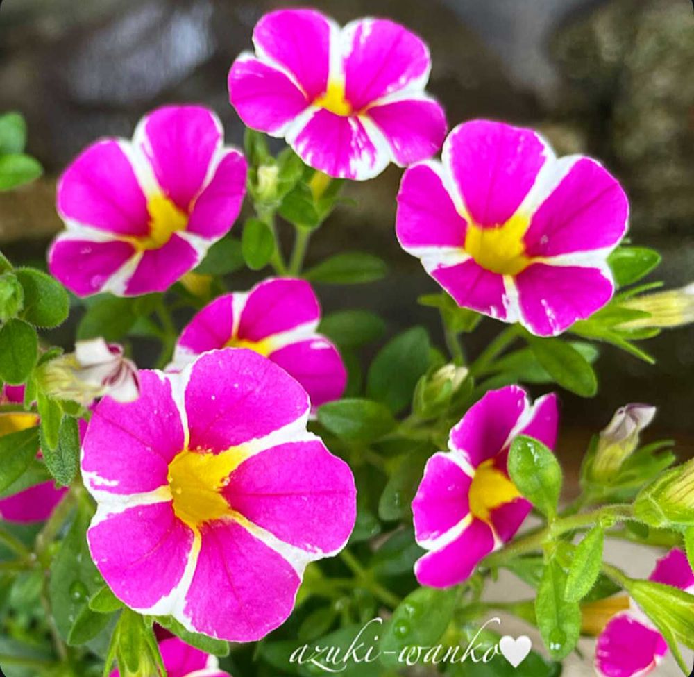 カリブラコア・スーパーベル・ホーラーカウ(学名:Calibrachoa hybrid 英名: Calibrachoa "Holy Cow”)の花🌸🌿🌺