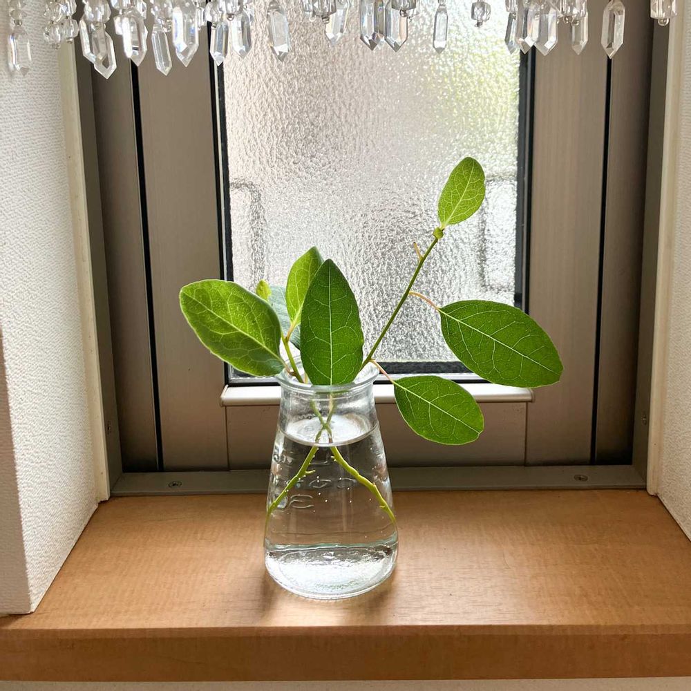 ②③窓を開けたらシンボルツリー作戦中のクロモジ。いらない交差枝を玄関に。少し涼しげになった気がします。(え?親の欲目⁉︎)